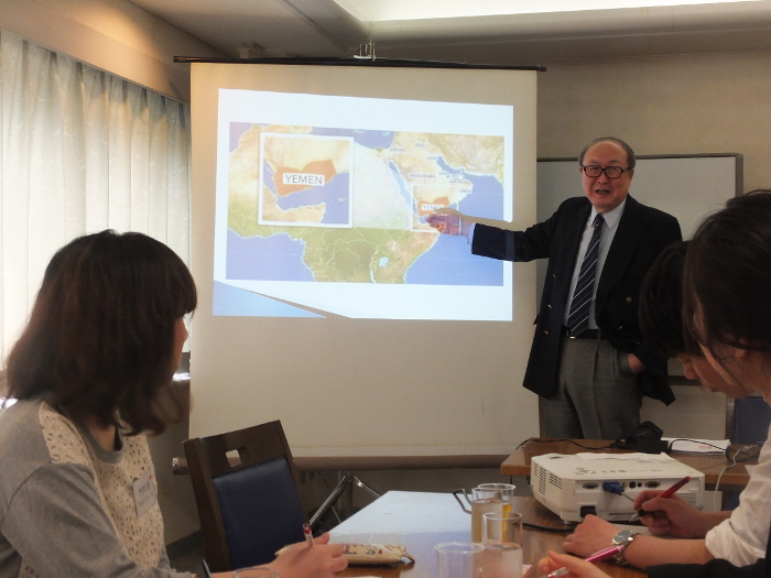 今回は、NHK解説委員長や、外務省外務報道官を経た後、(株)日本国際放送の社長などを40年近く務められ、現在は東京倶楽部の理事長を務められています高島肇久様にご講演を頂きました。主に、近年発生した様々な国際問題の背景や根底にある問題点などについて、非常に明確にお話し頂きました。 「どうなる世界。どうする日本」というタイトルの下、アラブ諸国の社会問題の根底にある宗教問題、高学歴の若者の職がないという問題、ISが拡大し続ける理由、またメディアと社会問題の関連性など非常に多岐にわたるトピックについてお話し頂きました。