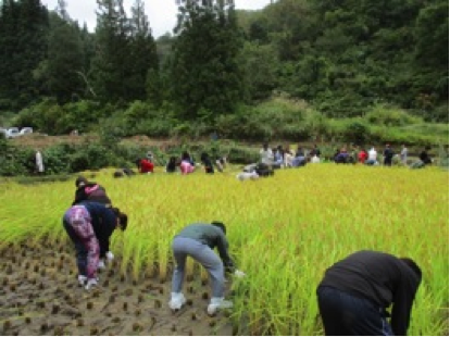 国際大学の学生と一緒に、総勢60名で農家の方に教わりながら稲刈りをしました。