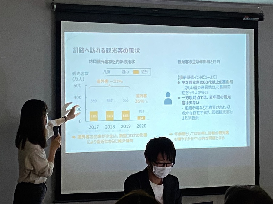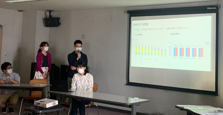 釧路市の地域興しを実現するため、参加者14名が3つのチームに別れて事業アイディアを競うコンペティションを行ないました。釧路市長や釧路市職員の方々から各アイディアへのフィードバックもいただき、釧路について深く学ぶことができました。