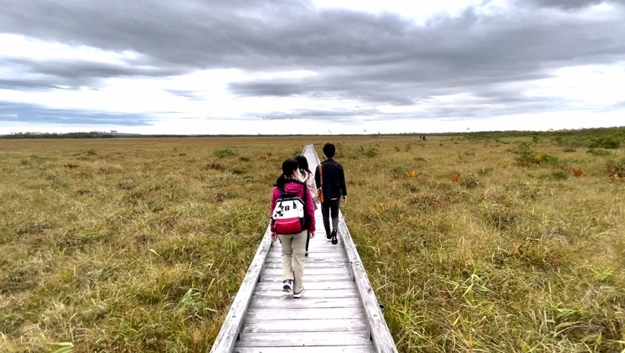 釧路湿原国立公園では湿原内を散策できる歩道が用意されており、自然と触れ合うことができます。今回の訪問では3つのチームに分かれ、湿原の魅力を伝える動画作成にもチャレンジしました。そのような活動を通して、メンバー間の仲が深まりました。