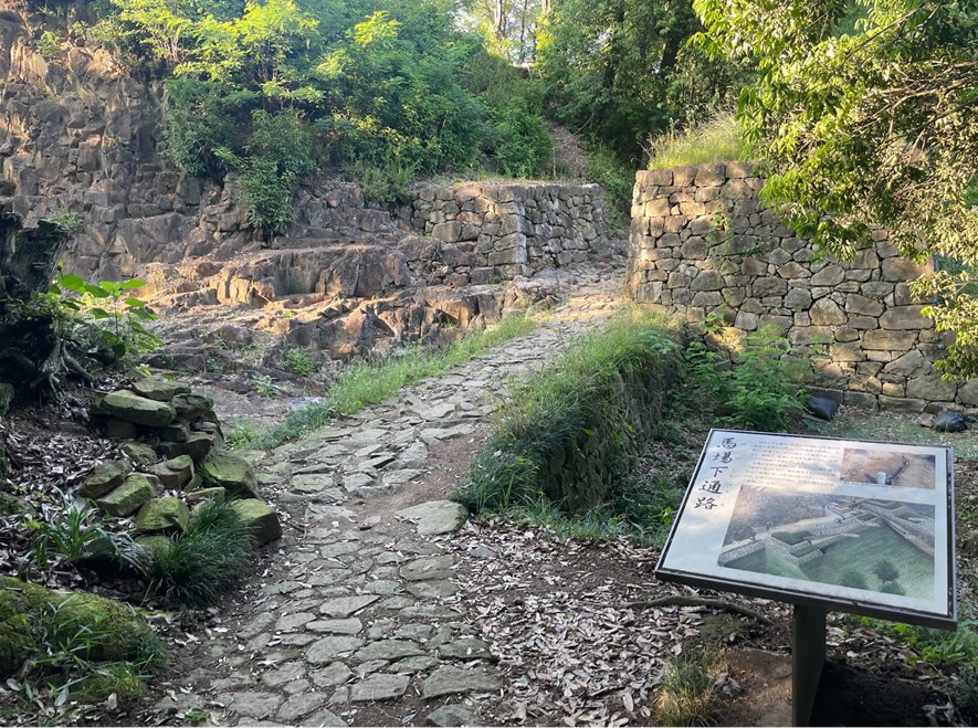 群馬国際アカデミーを出発後、関東7名城の一つである金山城の跡を訪れた。金山城は、15世紀に新田家により築城された、金山の地形を最大限に利用した山城である。尾根や人工的な谷により敵の侵入を遮り、物見台により敵を見張る機能を有していた。複数の武将による攻防にも落ちなかった「不落の城」と呼ばれる金山城の防御の工夫を実際に目で確認するとともに、山地と関東平野の中間に位置する群馬県の地理的歴史を学ぶことができた。