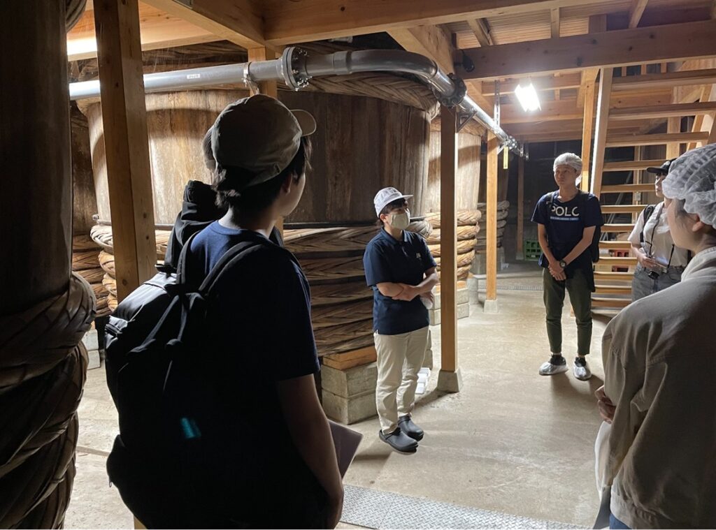 2日目は朝から、木桶を用いた伝統製法で236年間醤油造りを続けてこられた岡直三郎商店の大間々工場を見学した。問屋は足尾銅山への宿場町として栄え、近江商人がはじめたという。今は閉店も多いという街の中、価格競争で売れないものは作れないという農家の方の事情や、お土産やSNSでの工夫も伺えた。PJテーマに繋がる農業課題を、国の登録有形文化財(建造物)にしみ込んだ醤油の香りとともに、五感とともに記憶できた。