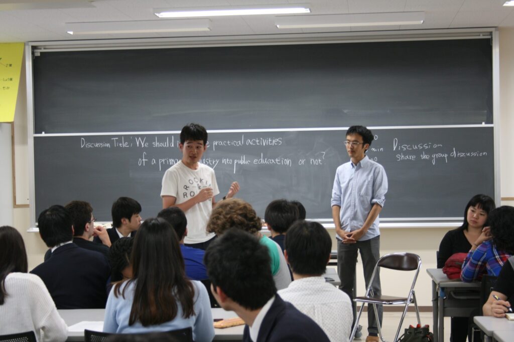 KIP学生、Nakatani学生、秋田の大学生、農業高校に通う高校生の4者が集い、「第一次産業の体験を必修にすべきか」について討論しました